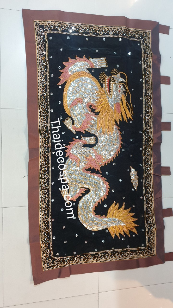 ปักรูปมังกรขนาดใหญ่ปักด้วยเลื่อม และเกร็ดเงิน ขนาด กว้าง180ซม. ยาว 100ซม.
